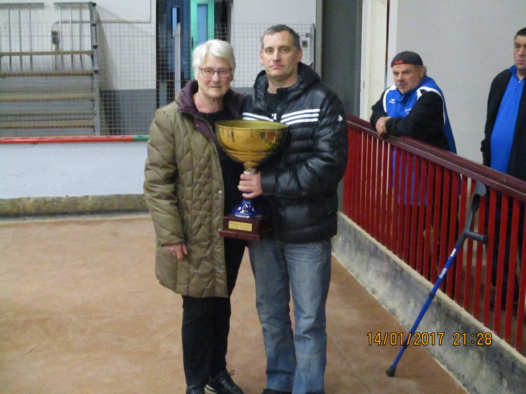 Nous avons eu beaucoup de plaisir a organiser ce samedi 14 janvier,la coupe Philippe Coasse qui nous a quitte après une terrible maladie en 2015.Ce concours a rassemblé 16 quadrettes 3 et 4 divisions avec une grande partie d'equipes du secteur Givordin,deux quadrettes de la boule d'Echalas ont fait la finale.La victoire revient a l'equipe Caillot,Blain,fayet,Francois contre Garcia,Juery,Gibert et Francois. C'est en présence de madame Coasse et de son fils Lionel (photo) que la remise des récompenses a eu lieu.