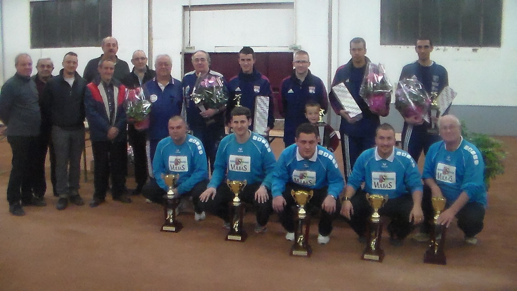 Les 8 et 9 Novembre,la Bansbanne Boules a organisée son traditionnel grand prix national en quadrettes 1 et 2 division.Ce concours a connu un beau succès avec la présence de 4 équipes de 1 division,trés peu de surprise sauf l'élimination de LARZELIER(St Vulbas) par l'équipe MOUNIER (Ampuis) à la deuxieme partie.Les favoris se sont retrouvés le dimanche matin en 1/4 de finale avec deux grosses parties entre BILON et RUILLAT (Lyon-Metropole) et JARRIGE contre FAURE(Valencin).Aprés le repas pris en commun entre les quatres équipes et les bénévoles de l'association,les 1/2 finales ont vus la vctoire de MONTILLET facilement contre MANCUSO(St Michel de Maurienne) et la victoire de JARRIGE beaucoup plus difficilement contre BILON (Lyon Metropole).La finale est revenue à l'équipe de Roger MONTILLET (St Vulbas) devant l'équipe Roger JARRIGE (Cro Lyon) sur le score de 13 a 3.C'est en présence de Mr ROUTABOUL (adjoint aux sports),Mr BAZIN (conseiller municipal),Mr LUREAU (Ets MURGIER donateur du concours) et de la vingtaine de bénévoles de l'association qui ont travaillés à l'organisation de se grand prix que c'est faite la remise des récompenses avant le vin d'honneur.